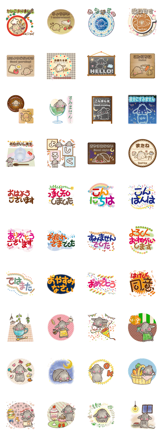 垂れ耳うさぎもちさまの、カフェをイメージしたスタンプです。かわいい食器に囲まれて、お洒落なカフェでランチでもいかが? 組み合わせて使う素材もあるよ!