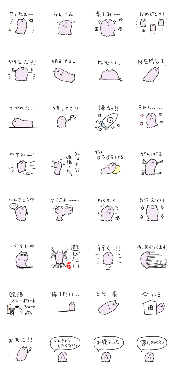 学校生活(大学生活含む)をゆるーく過ごすおばけねこの日常スタンプです。脱力系