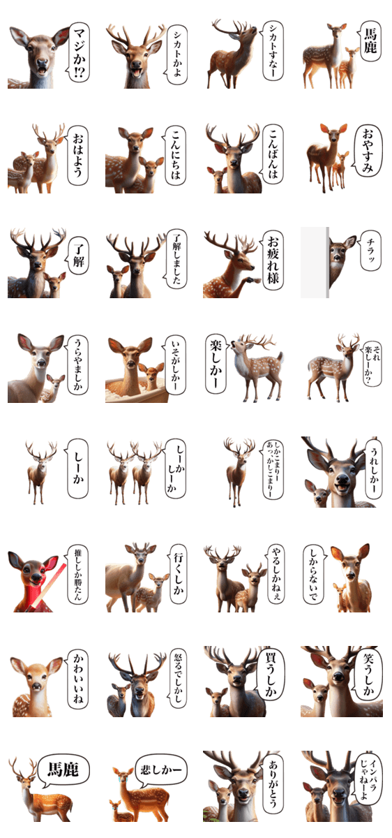 すこしリアルだけどかわいい鹿のスタンプ。かんたんにやりとりしたいときに便利なうえに癒しとシュールさとあいさつがあるので使いやすい。鹿の子/野生/自然/動物