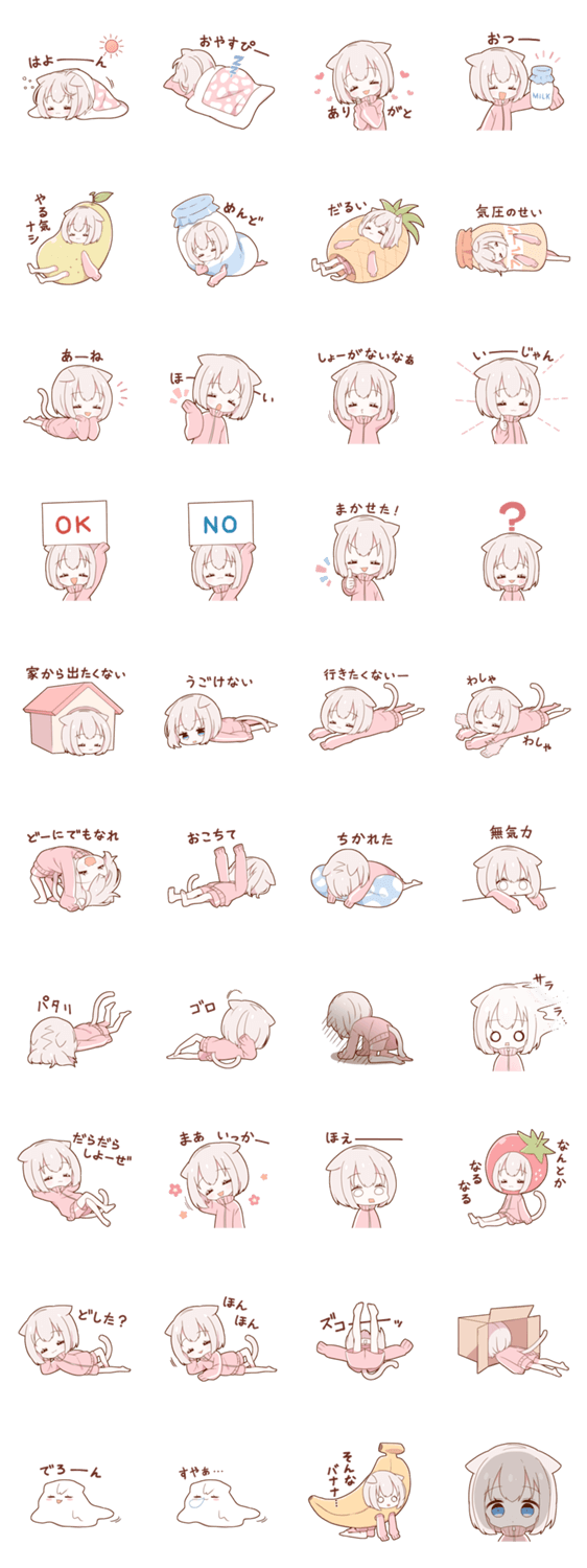 白くて小さい猫の女の子「ちびねこ女子」がひたすらになまけているスタンプです!やる気が出ない、のんびりしたい方にピッタリな日常で使えるセットです♪