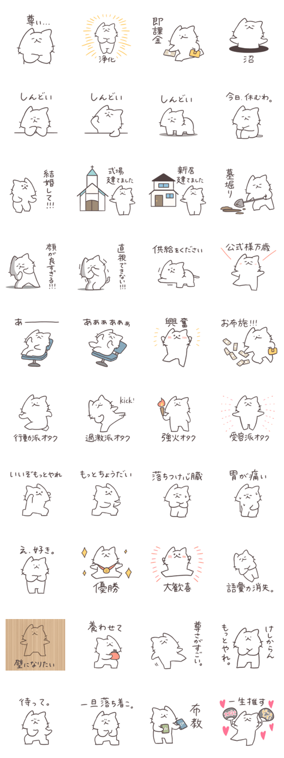可愛い白猫の使えるスタンプ!推し事に励む方向けの楽しいスタンプです。オタクのピクトグラムしろにゃんバージョン!推し活/オタ活/オタク/アイドル/アニメ/漫画