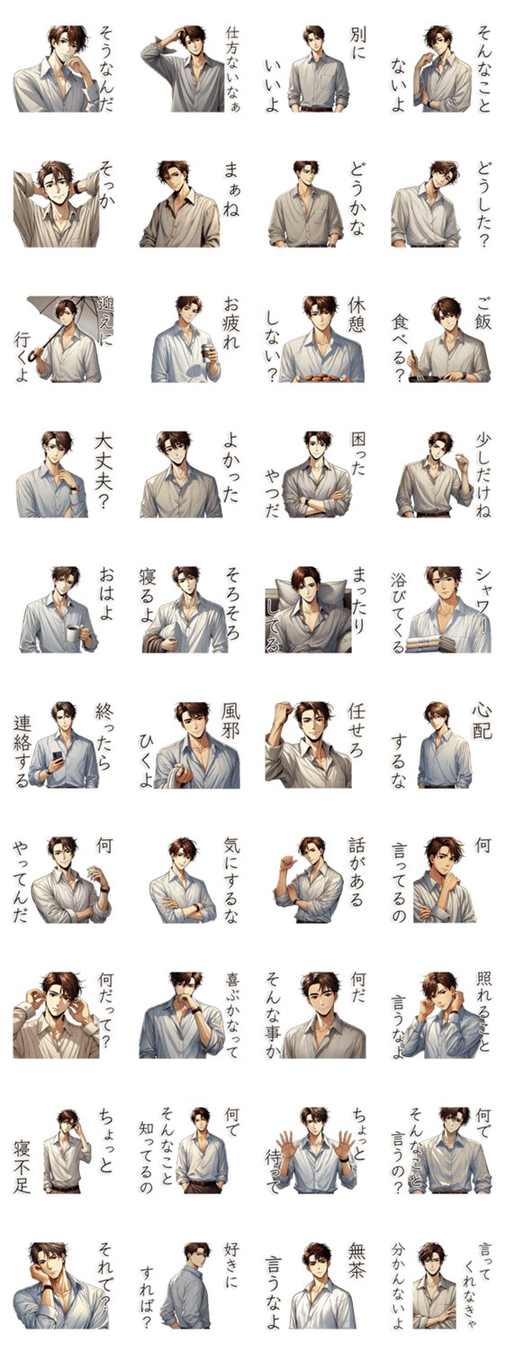 爽やかなワイシャツ姿の男性の日常を描いたスタンプコレクション。毎日のメッセージに使えます。大好きな彼や気になる彼へのプレゼントにもお勧めです。