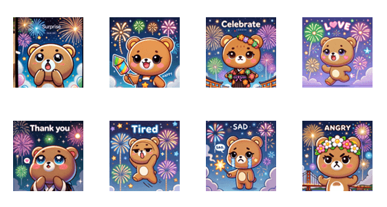 いいちびキャラクマが花火を楽しむスタンプです!夏やお祭りシーズンにぴったり。HAPPY、SAD、ANGRYなどの感情を表現。