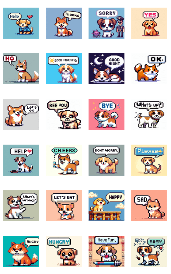 可愛いピクセルイヌがあなたの日常を彩ります。感情豊かなスタンプでコミュニケーションを楽しもう!