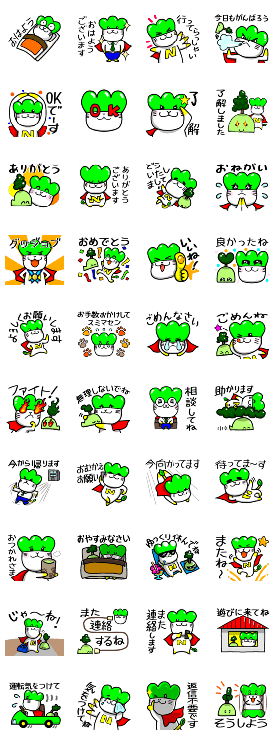 ネコと特産ピーマンをモチーフにした奥州市南都田(なつた)の「にゃんとぴマン」の日常使えるかわいいスタンプです♡角塚古墳「つのたん」と共に地元のヒーローめざします