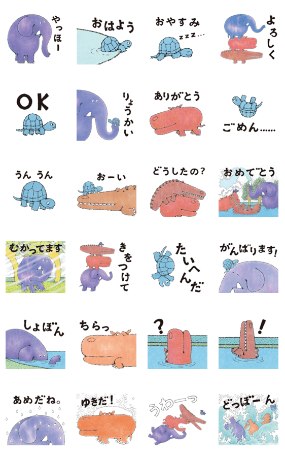 「ぞうくんのさんぽ」シリーズ(なかのひろたか 作)のLINEスタンプです。ぞうくんたちのほのぼのするやりとりを、LINEでもお楽しみください。