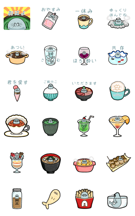 色んな湯呑み、茶碗、食べ物に入った茶柱みたいなアザラシ。茶柱ではないからお茶以外にも浸かってます。文字少なめでスタンプアレンジにも