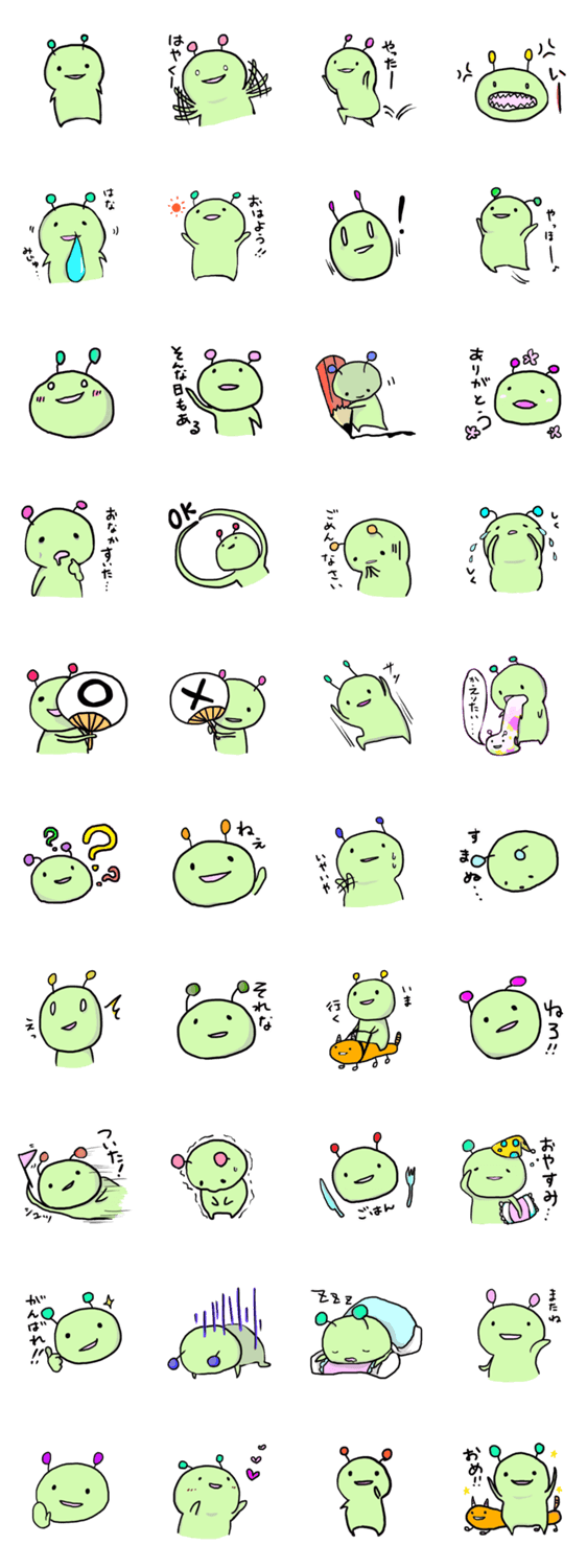 日常で気軽に使えるものがそろった、緑のムシっぽい生き物のスタンプです。肩の力を抜いてゆるーい会話をどうぞ。