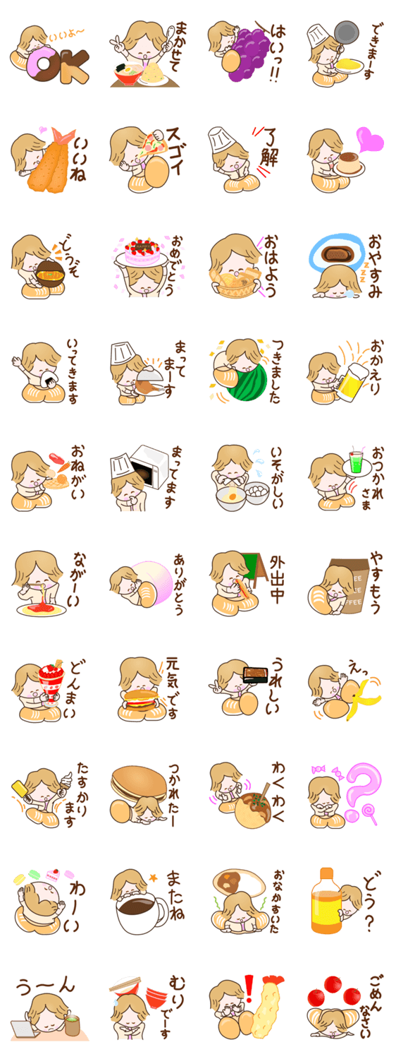 食べ物をつかった笑顔で元気なグルメのスタンプです。おなかすいた/外出中/ながーい/できまーす 等です。