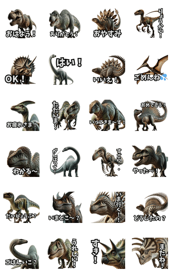 リアルな恐竜が登場するスタンプセットです。迫力満点の恐竜たちで、友達との会話を盛り上げましょう!日常のやりとりを楽しく、インパクトあるメッセージに。