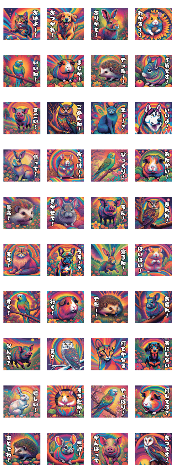 サイケデリックペットスタンプは、カラフルで幻想的なデザインの動物スタンプで、チャットにユニークで楽しいエネルギーを加えます。