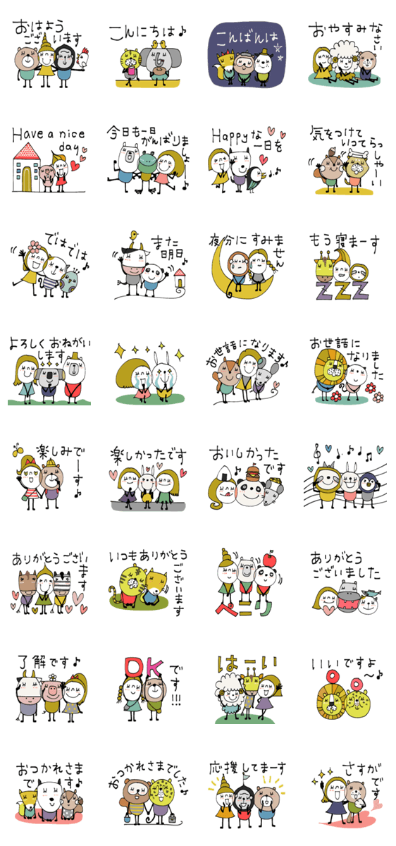 わちゃわちゃいつもくっついてます♪敬語で使いやすいセットです。おはよう/よろしく/了解/ありがとう/お疲れ様/など。