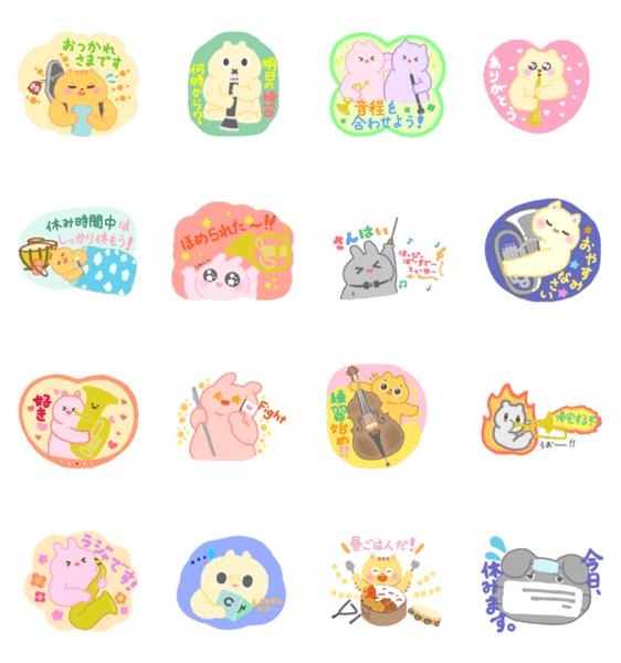 吹奏楽や楽器、音楽が好きな人のためのスタンプ♪フルート、オーボエ、クラリネット、サックス、トランペット、ホルン、トロンボーン、チューバ、打楽器などが登場!