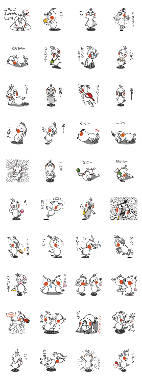 日常会話から色々なシーンで使えそうな、オカメインコさんぽいスタンプです。