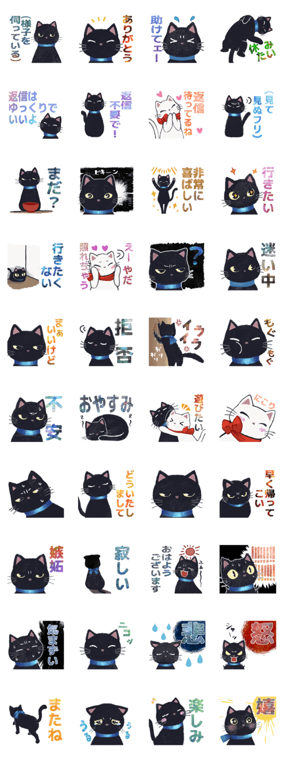 黒猫のスタンプです。 感情を表したものが多め。 白猫も少し居ます。