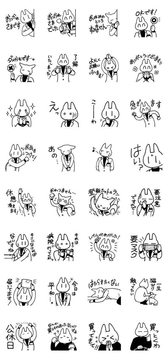 ドラッグストアで働く登録販売者「猫前さん」のスタンプです。 登録販売者が職場や家族に送るのに使えそうなフレーズを集めました。