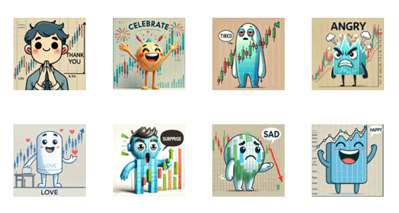 相場のチャートをモチーフにしたかわいいキャラクターが、喜怒哀楽を表現するスタンプです。