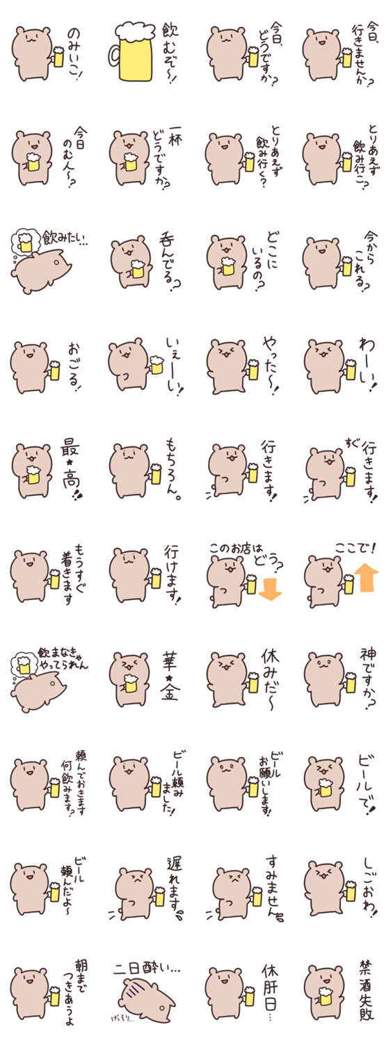 飲みに誘ったり誘われたりするクマのスタンプです。 飲み会/飲み/呑み/ビール/アルコール/酒/ネタ系/シュール/飲酒/飲みたい