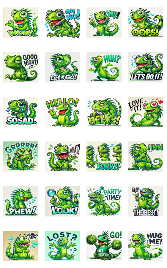 楽しいイグアナスタンプで、チャットにユーモアと楽しさをプラス!軽い会話にぴったりです。