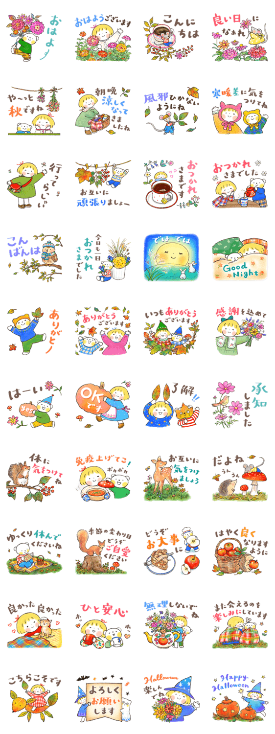 「はるちゃんとふうくん」の優しい言葉がたくさん詰まった秋のスタンプです。森の小さな動物たちが秋の始まりを教えてくれます♡[秋、敬老の日、ハロウィン、お月見、敬語]