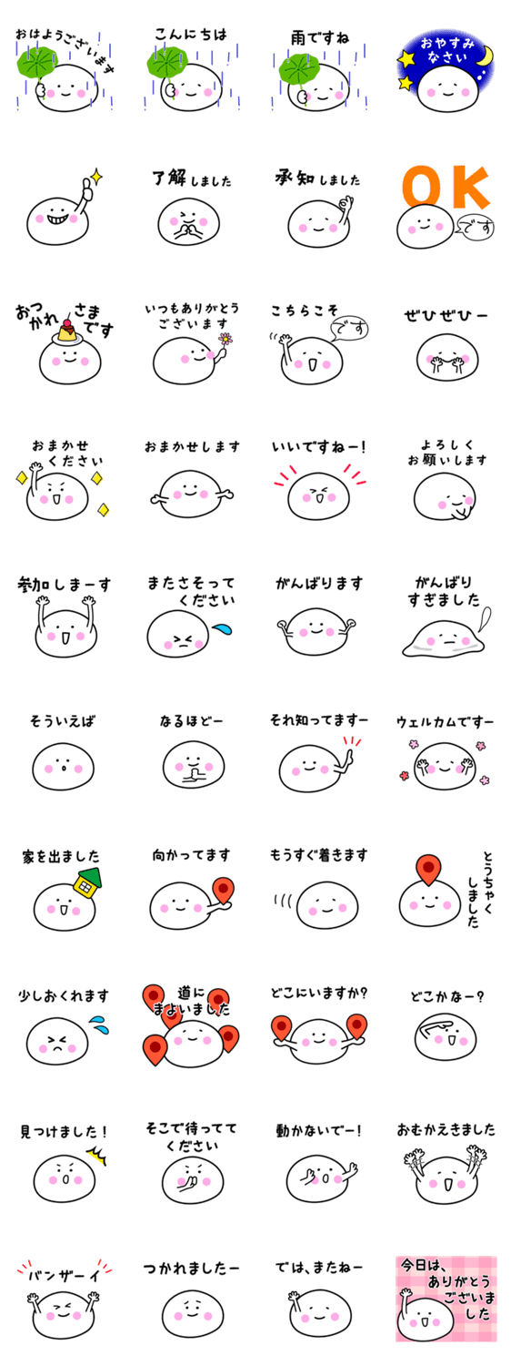 もっちさんはシンプルなイラストで、使う人を選ばず、誰にでも使いやすい内容です。よく使う日常会話に待ち合わせ多めな今回も、丁寧な言葉でかわいいスタンプにしました。