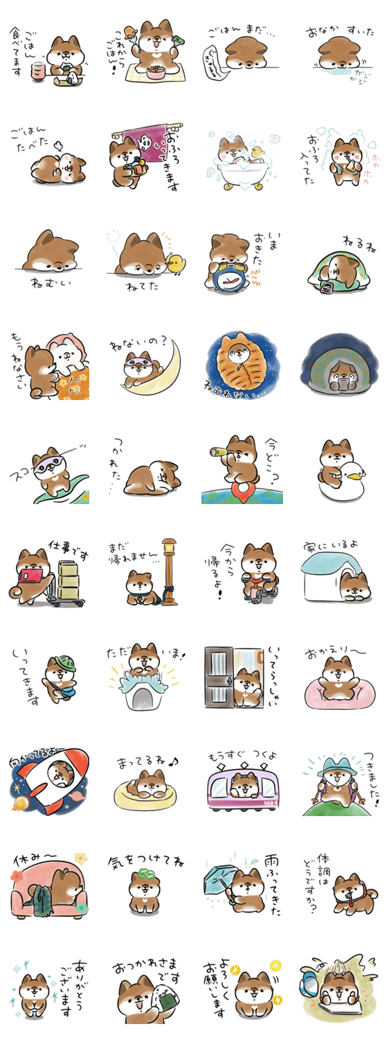 寝食やお風呂など、1日の状況に応じて返事をする柴犬のスタンプです