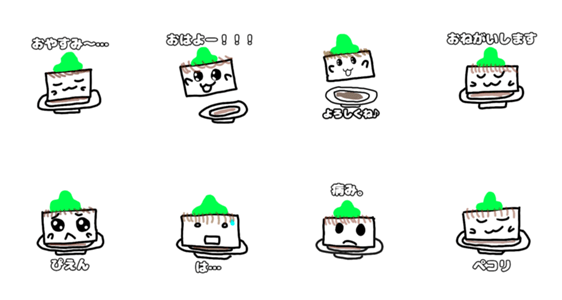 わさびの帽子に鰹節ヘアーなおとーふくんのスタンプです!!!豆腐メンタルな一面も…!?