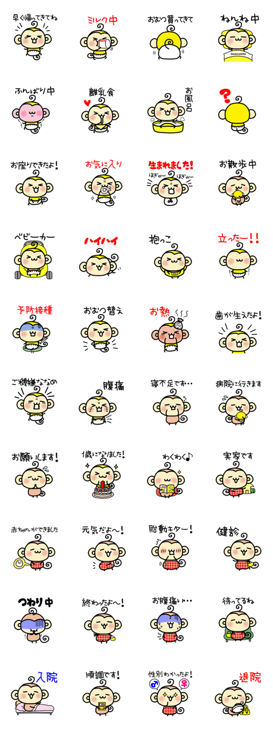 反抗期なおさるさんシリーズ第5弾。妊婦期~出産後まで使えるスタンプです。