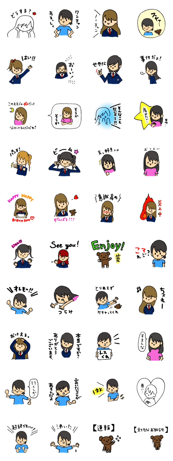 アイドルとヲタク(ファン)のスタンプです。かわいいアイドルちゃんもそれを応援するヲタク(ファン)のみなさんもぜひ使ってください。ときどきクマもいるよ。