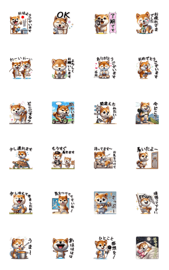 柴犬の愛らしい表情で、待ち合わせのやりとりを楽しくスムーズに!愉快で可愛い柴犬スタンプが、遅れそうな時や到着を伝えるのにぴったりです。