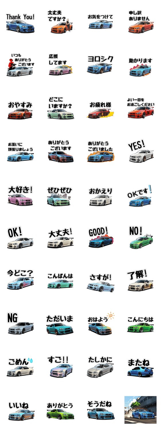 スポーツカーイラストと日常フレーズのコラボスタンプ。スタイリッシュなデザインで、様々なチャットをスピーディに盛り上げよう!