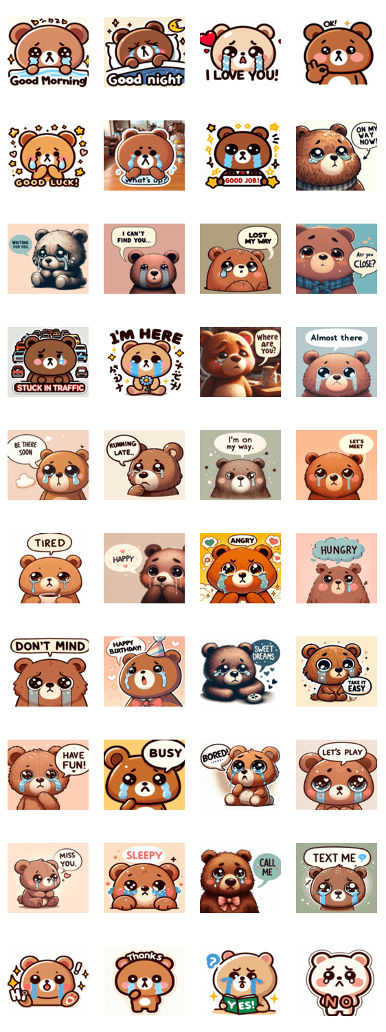 涙ぐむクマが、さまざまな感情を表現してくれます。日常の会話に感情を添えるスタンプです。
