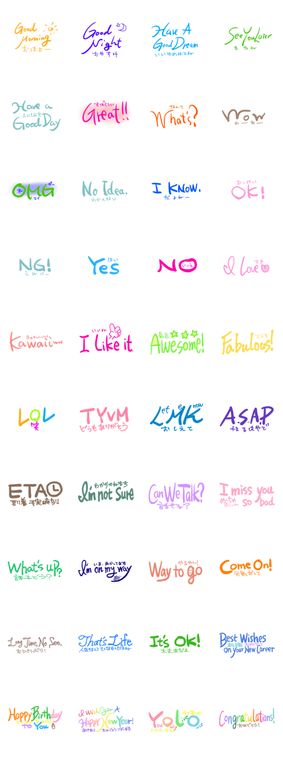 英語表記のカラフルなメッセージスタンプ。日本語付き。
