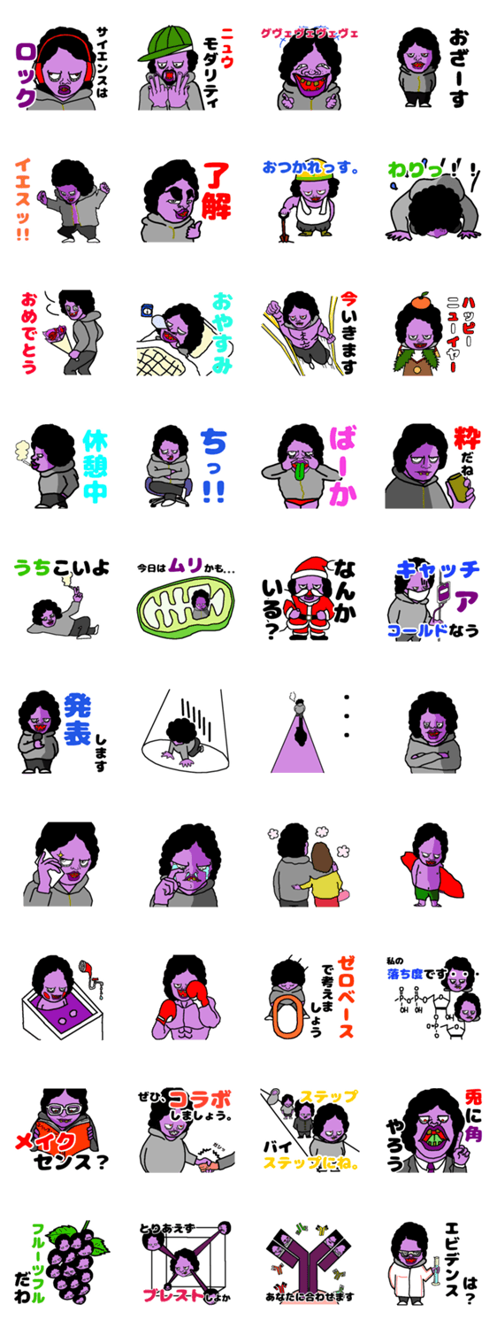 一見イケてる風の研究者、顔紫(カオムラサキ)君の日常がついにスタンプになりました。