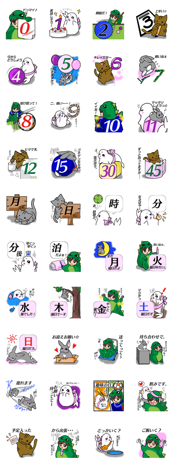日にちや時間のトークをしたい時に使える、数字スタンプです。現時点のむっちぃ作のキャラを総動員で、あなたの予定や時間のお知らせをお手伝いします。