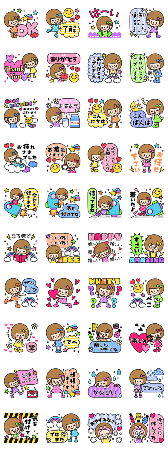 ポップでカラフルなスタンプ♡使いやすい言葉が盛り沢山!おかっぱ・リボン・女の子・可愛い・カラフル・ポップ・キュート・カラー・使いやすい・ため口・敬語・友達・家族