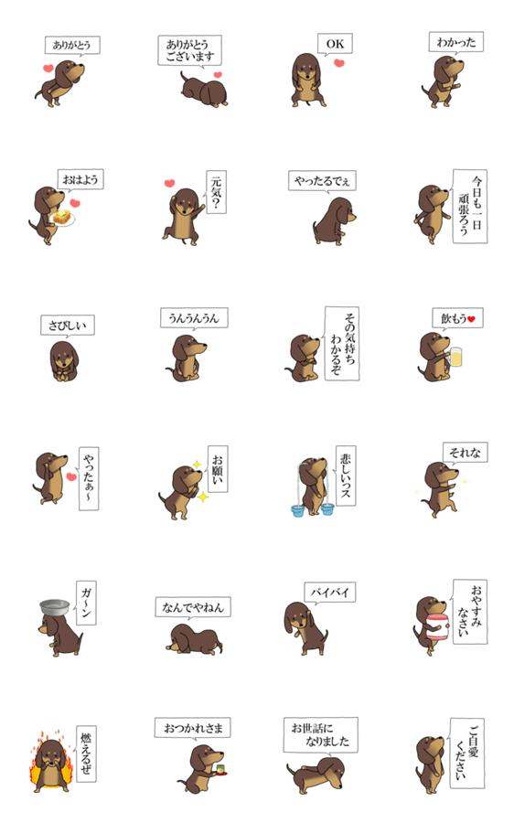 「激しく尻尾をふるイヌ」シリーズのダックス。毎日使えるスタンプです。