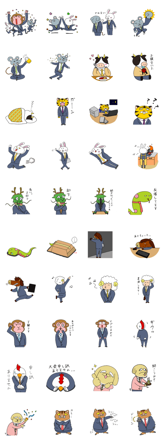 十二支の動物たちがサラリーマンになりました。社会人の日常会話に干支の動物たちを添えてお楽しみください。