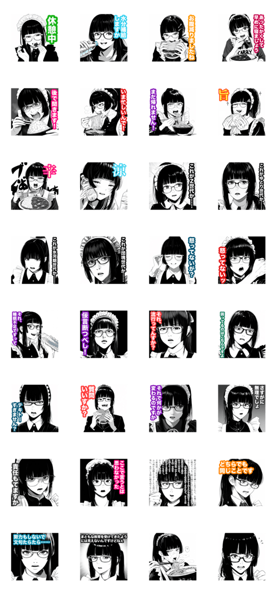 黒髪眼鏡女子たちによる怒涛のスタンプです。メイドさんを多めにしときました。