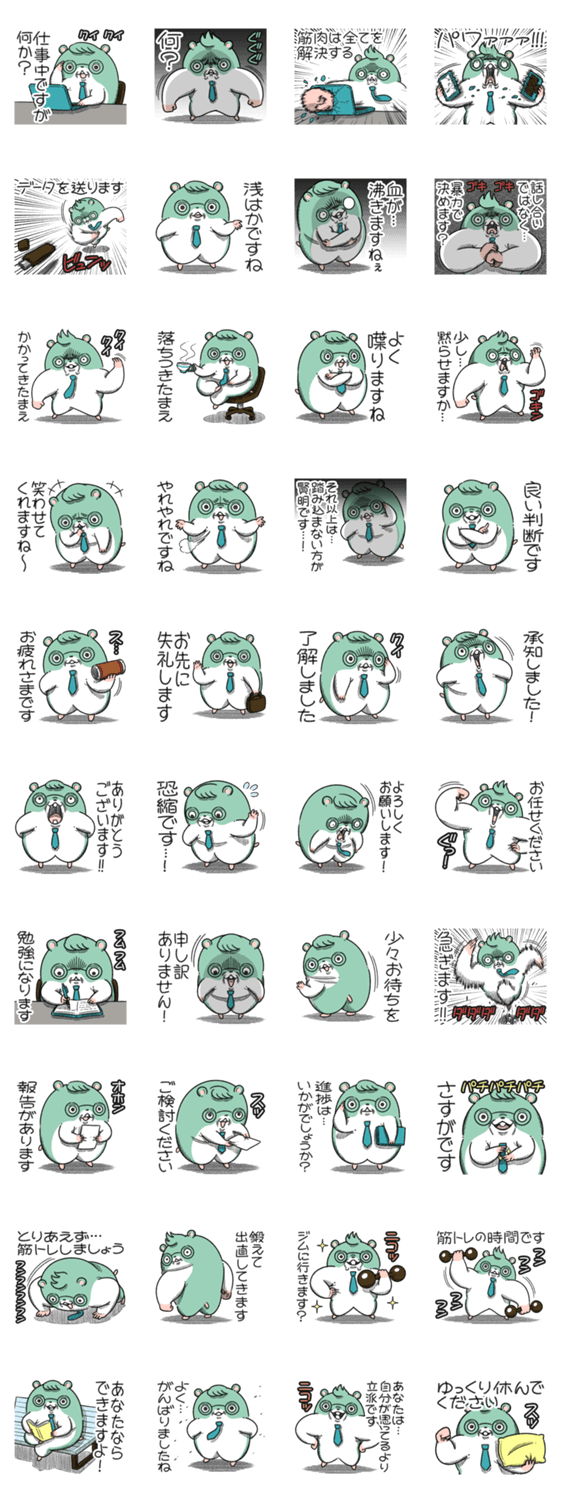 キョムスターの同僚の事務仕事をするハムスター。 筋トレ好きで、ジムに通うのが日課。 毎日使える/笑える/面白い/かわいい/ゆるい/シュール/日常/会話/会社/敬語/仕事