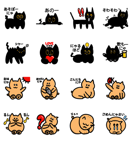 黒猫ココたんと、しましまキラたんのスタンプです かぁたんが描きました