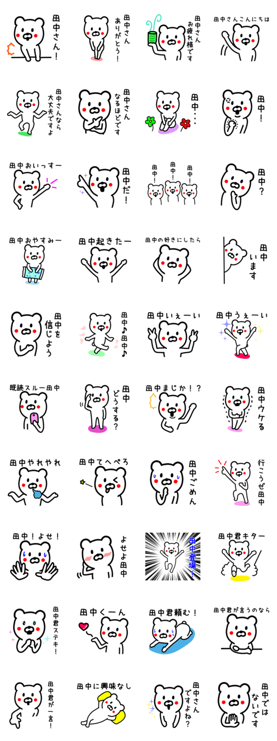 名字が田中(たなか)さんに便利なくまのスタンプです。田中さん本人はもちろん、田中さんじゃない人(佐藤さん、鈴木さん、高橋さん)も使えます。あなたの周りの田中さんに。