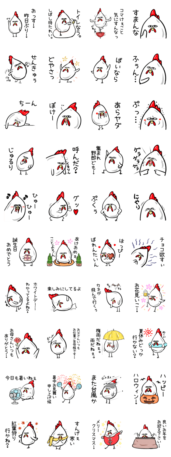 2017年の干支の鶏(にわとり)のスタンプです。挨拶,煽り系,相槌,春夏秋冬のイベント関連(バレンタイン,花見,ハロウィン,クリスマス,年末年始/正月/年賀状)等色々入れてます