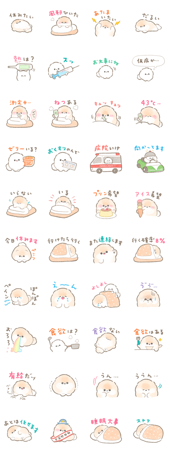 体調不良の時に使える、ポメラニアンのぽぽちスタンプ。 熱があるとき、頭が痛いとき、どうしても休みたい...! 具合が悪い時のコミュニケーションに ꒰ ՞•ﻌ•՞ ꒱