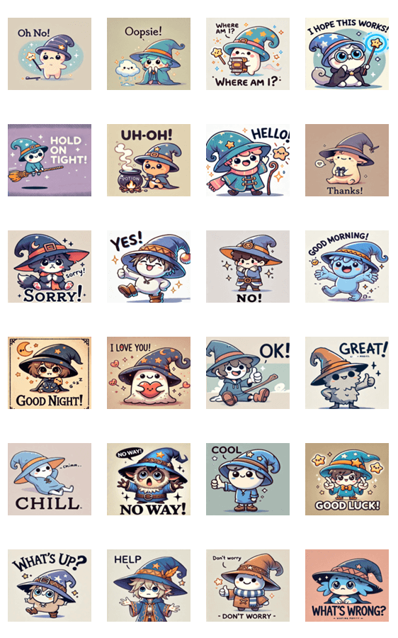 助けを求めたり、安心させたりする、かわいいポンコツ魔法使いの心温まる表情集です。優しいやり取りにぴったりのスタンプです。