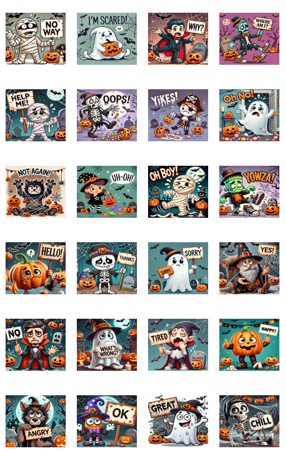 ユニークでポンコツなキャラクターたちが登場するハロウィンスタンプセットです。ハロウィンの会話を楽しく演出!