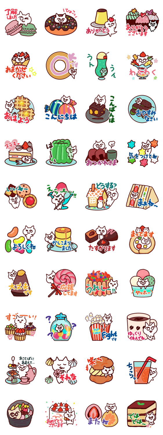 しろねこみーたんのお菓子シリーズ。ポップでキュートなスイーツとにゃんこのスタンプです。華やかなデザートで明るく可愛い♪ネコ好きな方もぜひ♡日常使い用です。