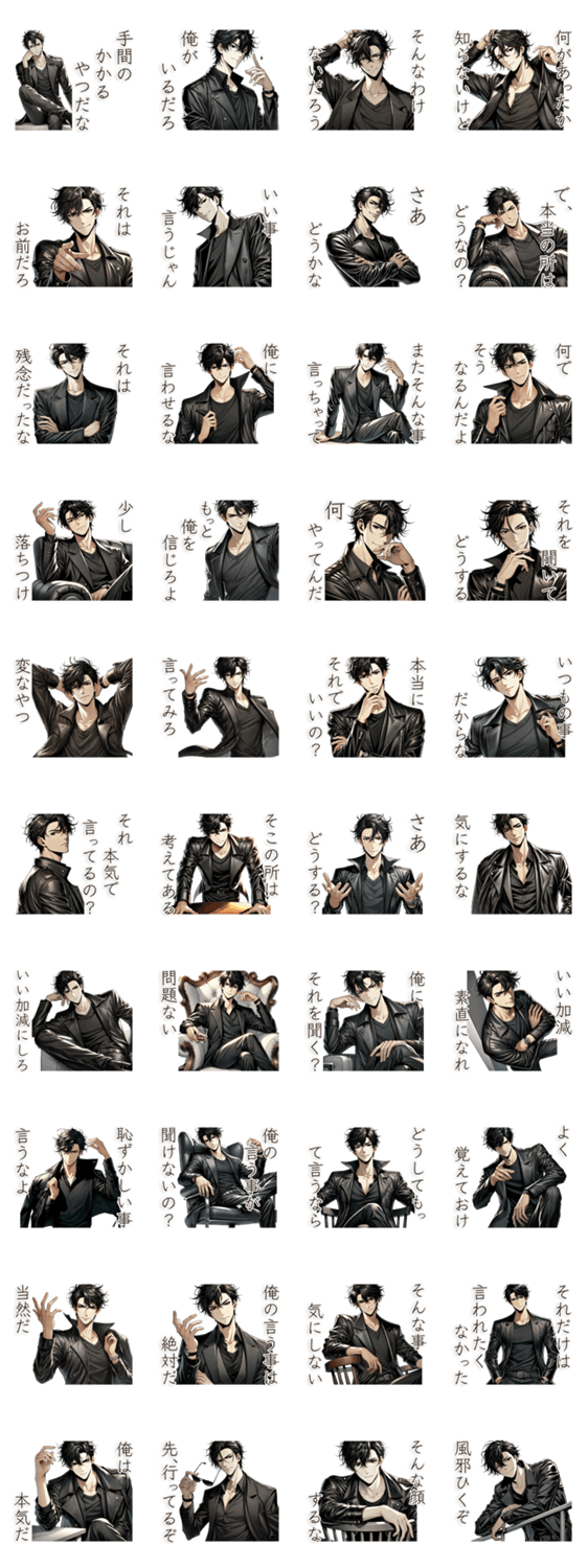 ドSで俺様な革ジャン姿の黒髪男性スタンプ集!傲慢で自信たっぷり、クールなイケメンが上から目線でトークを支配。特別な人へのプレゼントにも最適!