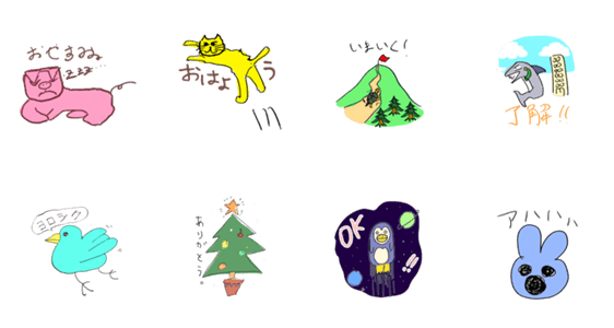 絵を描く事を諦めなかった彼の絵を、スタンプ化してみました。(後ろ2つは数合わせの為別人の物です。)