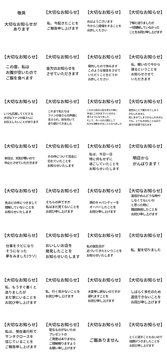 大切なお知らせ、重大発表など面白いネタで使えるドッキリスタンプです。家族/友達/恋人/親子/親戚/大学/高校/小学生/日常生活